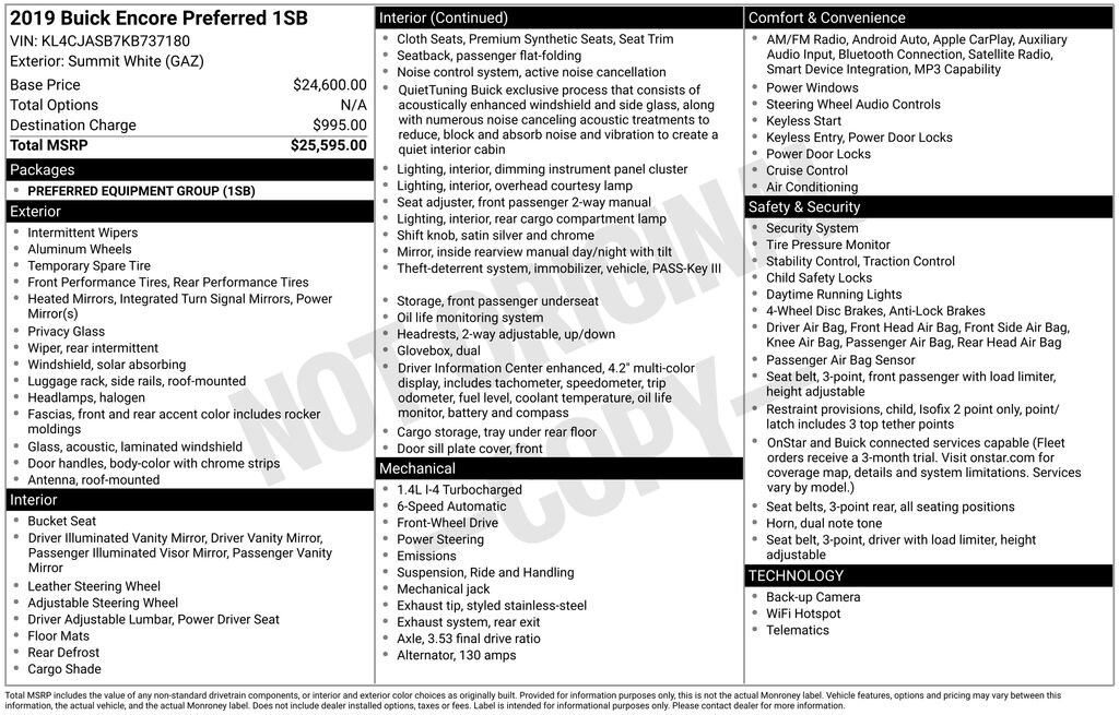 Recent Arrival! 2019 Buick Encore Preferred in Summit White vehicle highlights include, **ALLOY WHEELS**, **KEYLESS ENTRY**, **BACK UP CAMERA**, *PREMIUM SOUND SYSTEM**, **KEYLESS START**, **MANY MORE OPTIONS**. Summit White 2019 Buick Encore Preferred