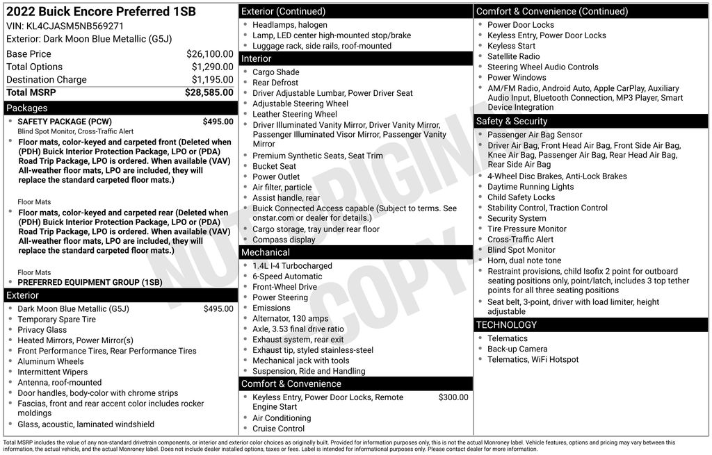 CARFAX One-Owner. Clean CARFAX. Priced below KBB Fair Purchase Price! Odometer is 9002 miles below market average! 2022 Buick Encore Preferred in Blue Metallic vehicle highlights include, **CLEAN CARFAX**, **ONE OWNER**, **ALLOY WHEELS**, **KEYLESS ENTRY**, **MULTI-ZONE CLIMATE CONTROL**, **BACK UP CAMERA**, ** MULTI FUNCTION STEERING WHEELS**, *PREMIUM SOUND SYSTEM**, **REAR PARKING AID**, **MUCH MORE**. Blue Metallic 2022 Buick Encore Preferred