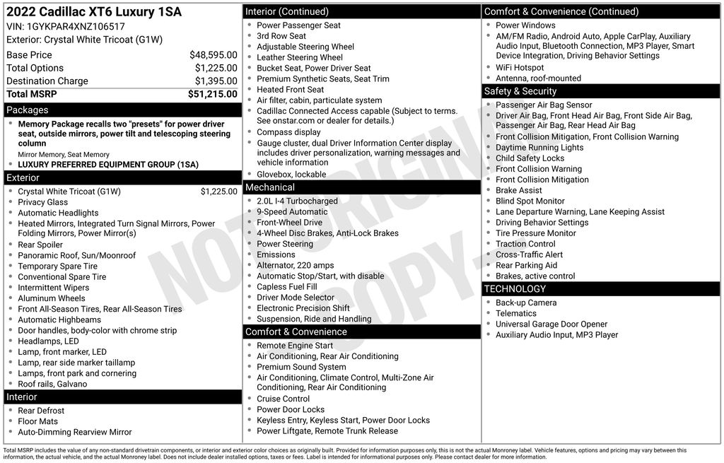 Recent Arrival! Priced below KBB Fair Purchase Price! 2022 Cadillac XT6 Luxury in Crystal White Tricoat vehicle highlights include, **ALLOY WHEELS**, **KEYLESS ENTRY**, **MULTI-ZONE CLIMATE CONTROL**, **BACK UP CAMERA**, **POWER SEATS**, *PREMIUM SOUND SYSTEM**, **REAR PARKING AID**, **KEYLESS START**, **MANY MORE OPTIONS**. Crystal White Tricoat 2022 Cadillac XT6 Luxury