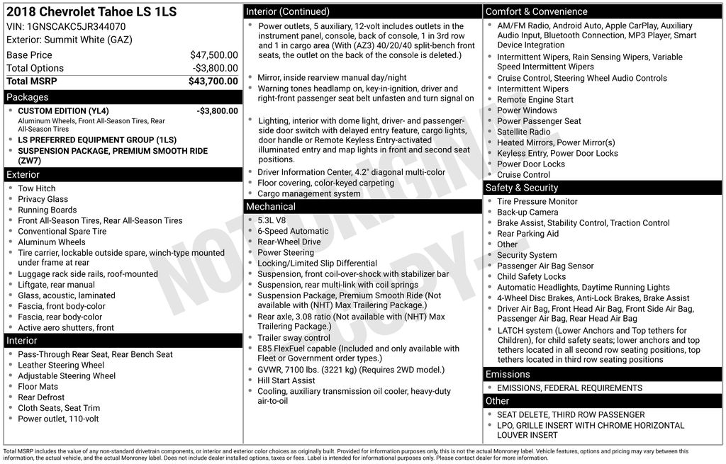 Priced below KBB Fair Purchase Price! Black Cloth. Summit White 2018 Chevrolet Tahoe LS