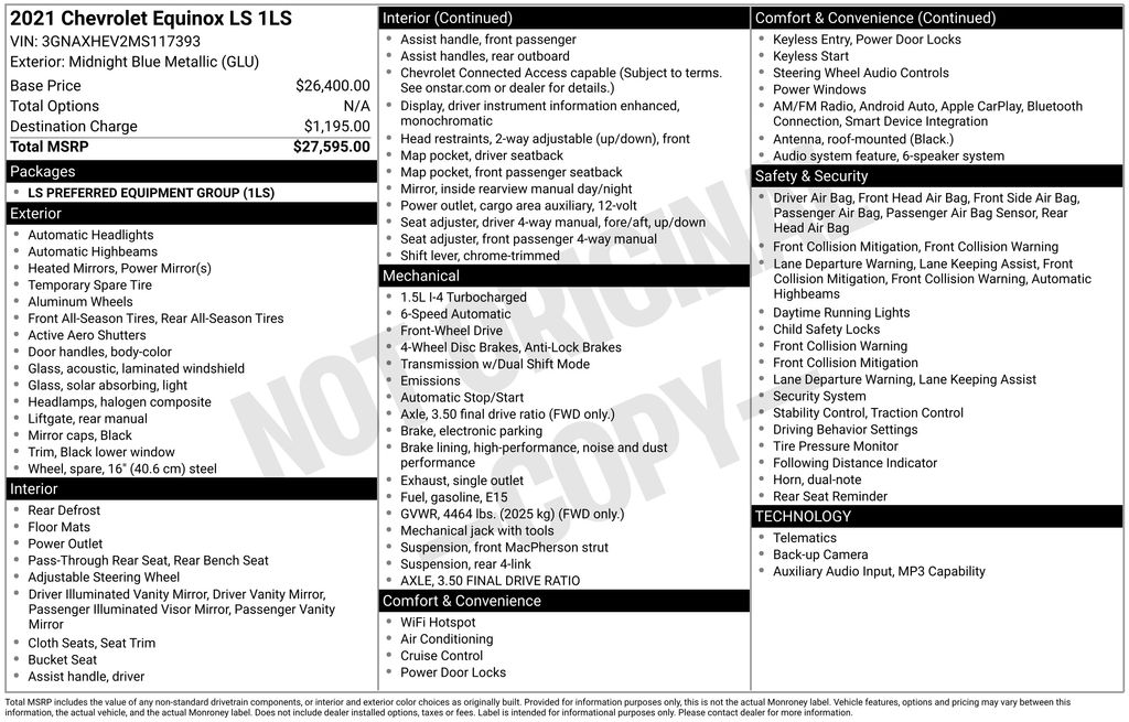 Recent Arrival! Clean CARFAX. Priced below KBB Fair Purchase Price! 2021 Chevrolet Equinox LS in Midnight Blue Metallic vehicle highlights include, **CLEAN CARFAX**, **ALLOY WHEELS**, **KEYLESS ENTRY**, **MULTI-ZONE CLIMATE CONTROL**, **BACK UP CAMERA**, *PREMIUM SOUND SYSTEM**, **REAR PARKING AID**, **MANY MORE OPTIONS**. Midnight Blue Metallic 2021 Chevrolet Equinox LS