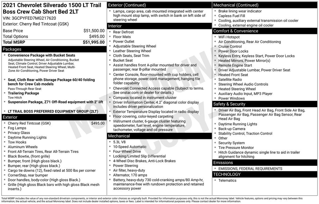 CARFAX One-Owner. Priced below KBB Fair Purchase Price! Odometer is 14648 miles below market average! 2021 Chevrolet Silverado 1500 LT Trail Boss in Cherry Red Tintcoat vehicle highlights include, **ONE OWNER**, **STILL UNDER FACTORY WARRANTY**, **ALLOY WHEELS**, **KEYLESS ENTRY**, **POWER SEATS**, *PREMIUM SOUND SYSTEM**, **KEYLESS START**, **MANY MORE OPTIONS**, 10-Speed Automatic, 4WD, Gideon/Very Dark Atmosphere w/Cloth Seat Trim. Cherry Red Tintcoat 2021 Chevrolet Silverado 1500 LT Trail Boss