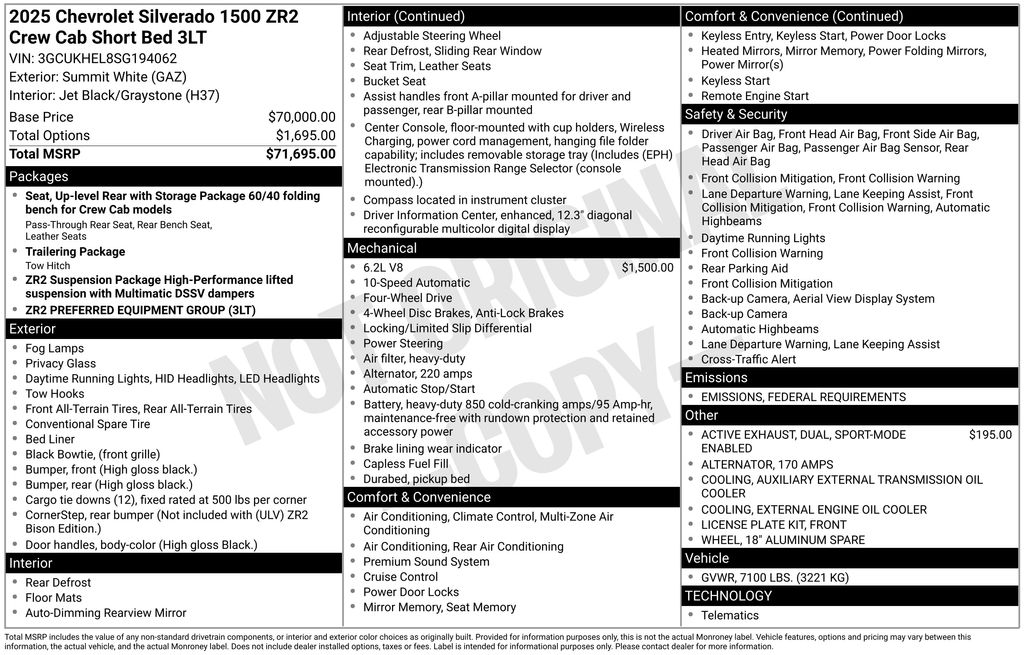 CARFAX One-Owner. Clean CARFAX. 2025 Chevrolet Silverado 1500 ZR2 in Summit White vehicle highlights include, **CLEAN CARFAX**, **ONE OWNER**, **STILL UNDER FACTORY WARRANTY**, **KEYLESS ENTRY**, **BACK UP CAMERA**, *PREMIUM SOUND SYSTEM**, **BED LINER**, **MANY MORE OPTIONS**, 10-Speed Automatic, 4WD, Jet Black/Graystone Leather. Summit White 2025 Chevrolet Silverado 1500 ZR2