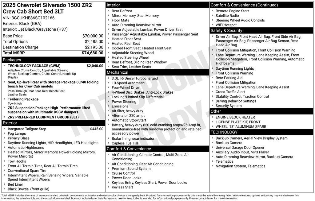 CARFAX One-Owner. Clean CARFAX. 2025 Chevrolet Silverado 1500 ZR2 in Black vehicle highlights include, **CLEAN CARFAX**, **ONE OWNER**, **STILL UNDER FACTORY WARRANTY**, **ALLOY WHEELS**, **LEATHER**, **KEYLESS ENTRY**, **BLUETOOTH**, **BACK UP CAMERA**, **POWER SEATS**, ** MULTI FUNCTION STEERING WHEELS**, **20" WHEELS**, *PREMIUM SOUND SYSTEM**, **REAR PARKING AID**, **RUNNING BOARDS**, **BED LINER**, **KEYLESS START**, **MANY MORE OPTIONS**, 10-Speed Automatic, 4WD, Jet Black/Graystone Leather. Black 2025 Chevrolet Silverado 1500 ZR2