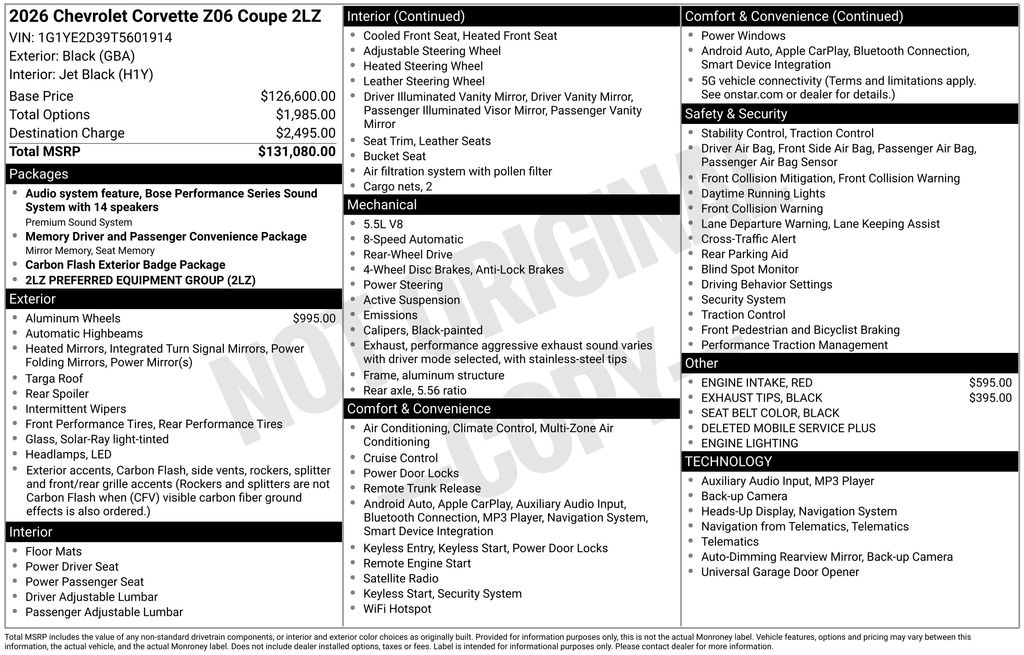 CARFAX One-Owner. Clean CARFAX. 2026 Chevrolet Corvette Z06 in Black vehicle highlights include, **CLEAN CARFAX**, **ONE OWNER**, **STILL UNDER FACTORY WARRANTY**, **ALLOY WHEELS**, **LEATHER**, **KEYLESS ENTRY**, **MULTI-ZONE CLIMATE CONTROL**, **BACK UP CAMERA**, **POWER SEATS**, ** MULTI FUNCTION STEERING WHEELS**, **SATTALITE RADIO**, **REMOTE START**, **COOLED &HEATED SEATS**, *PREMIUM SOUND SYSTEM**, **REAR PARKING AID**, **KEYLESS START**, **MANY MORE OPTIONS**. Black 2026 Chevrolet Corvette Z06 2LZ