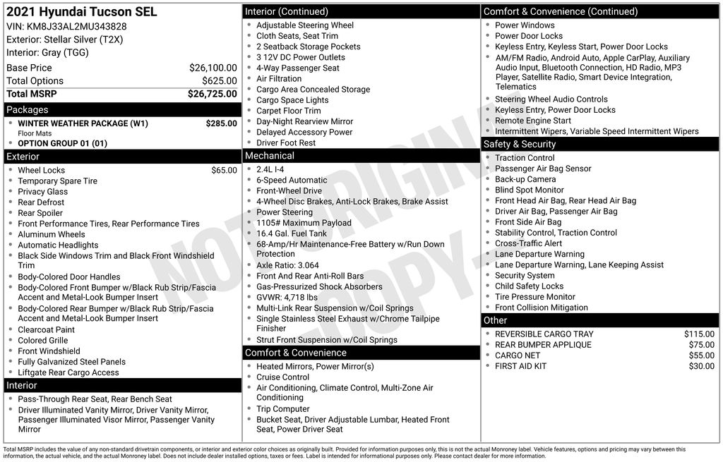 Priced below KBB Fair Purchase Price! Odometer is 11733 miles below market average! 2021 Hyundai Tucson SEL in Stellar Silver vehicle highlights include, **ALLOY WHEELS**, **KEYLESS ENTRY**, **BACK UP CAMERA**, ** MULTI FUNCTION STEERING WHEELS**, *PREMIUM SOUND SYSTEM**, **MUCH MORE**. Stellar Silver 2021 Hyundai Tucson SEL