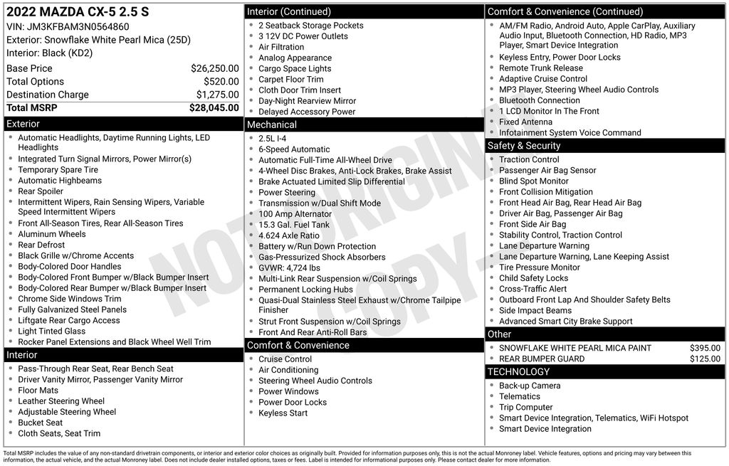 Clean CARFAX. Odometer is 4587 miles below market average! 2022 Mazda CX-5 2.5 S in Snowflake White Pearl vehicle highlights include, **CLEAN CARFAX**, **ALLOY WHEELS**, **KEYLESS ENTRY**, **MULTI-ZONE CLIMATE CONTROL**, **BACK UP CAMERA**, *PREMIUM SOUND SYSTEM**, **REAR PARKING AID**, **KEYLESS START**, **MANY MORE OPTIONS**. Snowflake White Pearl 2022 Mazda CX-5 2.5 S