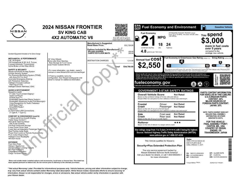 CARFAX One-Owner. Clean CARFAX. Odometer is 4097 miles below market average! Glacier White 2024 Nissan Frontier SV