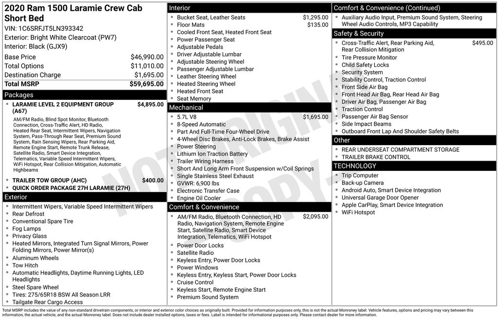 Recent Arrival! CARFAX One-Owner. Clean CARFAX. Priced below KBB Fair Purchase Price! Odometer is 5011 miles below market average! 2020 Ram 1500 Laramie in Bright White Clearcoat vehicle highlights include, **CLEAN CARFAX**, **ONE OWNER**, **ALLOY WHEELS**, **LEATHER**, **KEYLESS ENTRY**, **MULTI-ZONE CLIMATE CONTROL**, **BACK UP CAMERA**, **POWER SEATS**, ** MULTI FUNCTION STEERING WHEELS**, *PREMIUM SOUND SYSTEM**, **REAR PARKING AID**, **RUNNING BOARDS**, **BED LINER**, **MUCH MORE**. Bright White Clearcoat 2020 Ram 1500 Laramie