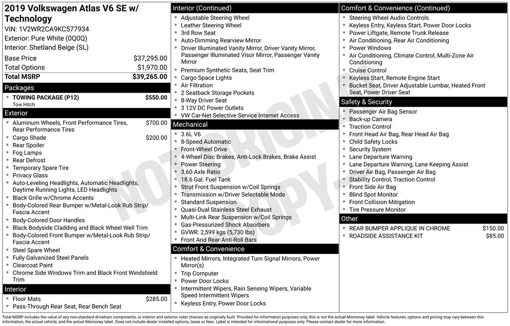 Clean CARFAX. Priced below KBB Fair Purchase Price! Odometer is 30874 miles below market average! White 2019 Volkswagen Atlas 3.6L V6 SE w/Technology